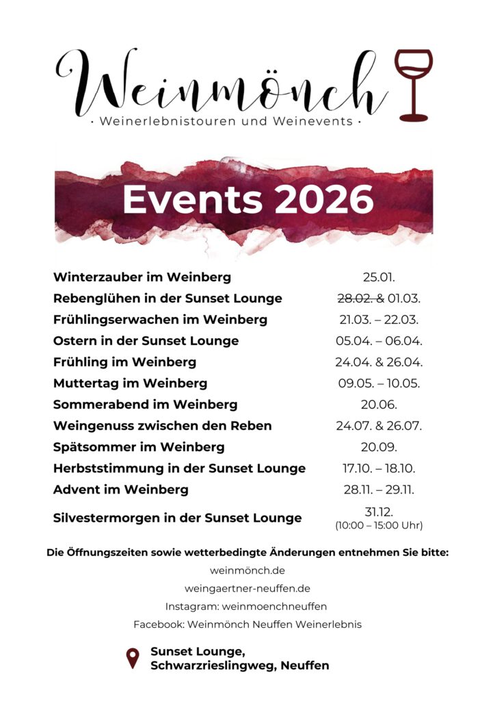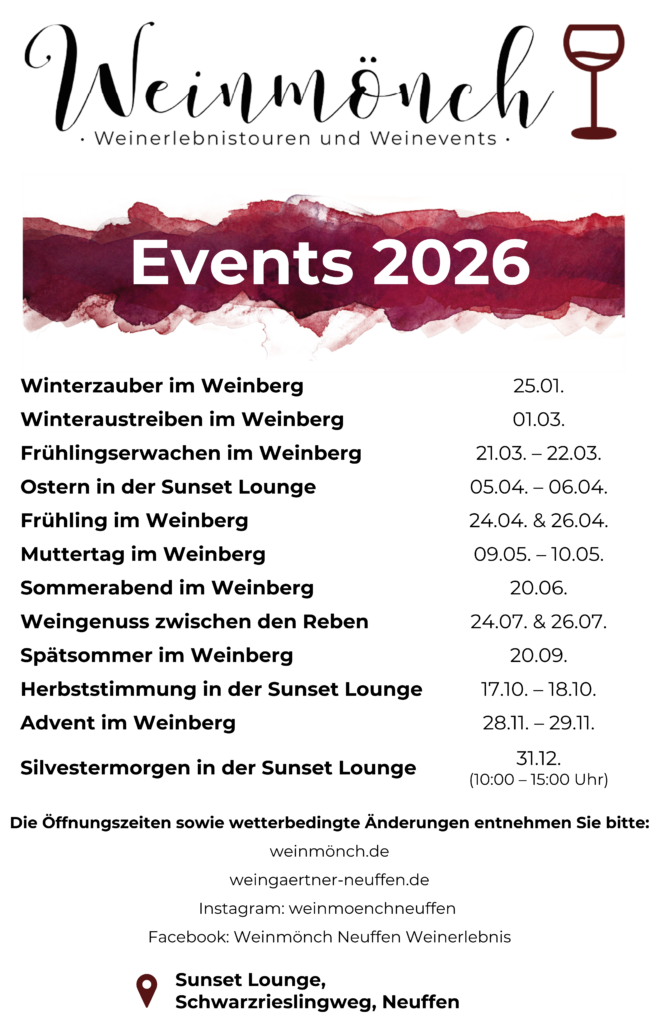 Buchbar ab 15 Personen für Firmenevents (Incentive), JGA (Junggesellinen-/Junggesellenabschied), Familienfeiern und Freunden. Genießen Sie ein Weinerlebnis mitten in den Neuffener Weinbergen. Gerne können Sie mich bei Interesse kontaktieren.
